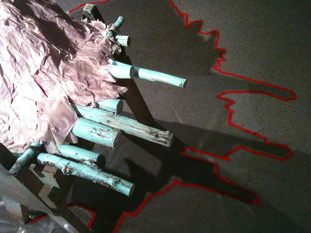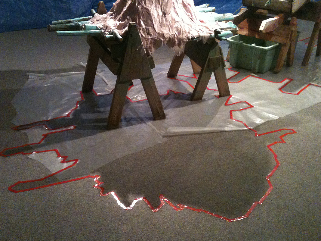 Sawhorses, fish tray, ice blocks, plastic, vinyl tape, embroidered tarp, newsprint from Corner Brook Paper Mill, carved pressure-treated wood, painted driftwood